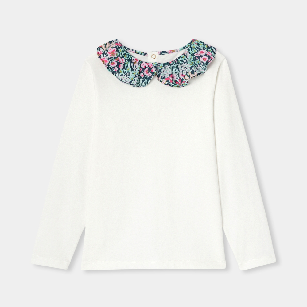 Günlük gardırobun vazgeçilmezi olan bu kız çocuk tişört, zarif Liberty kumaştan yapılmış yakasıyla öne çıkar. Yumuşak ve esnek organik pamuktan üretilen model, romantik havasıyla şortlar ve pantolonlarla mükemmel bir uyum sağlar.