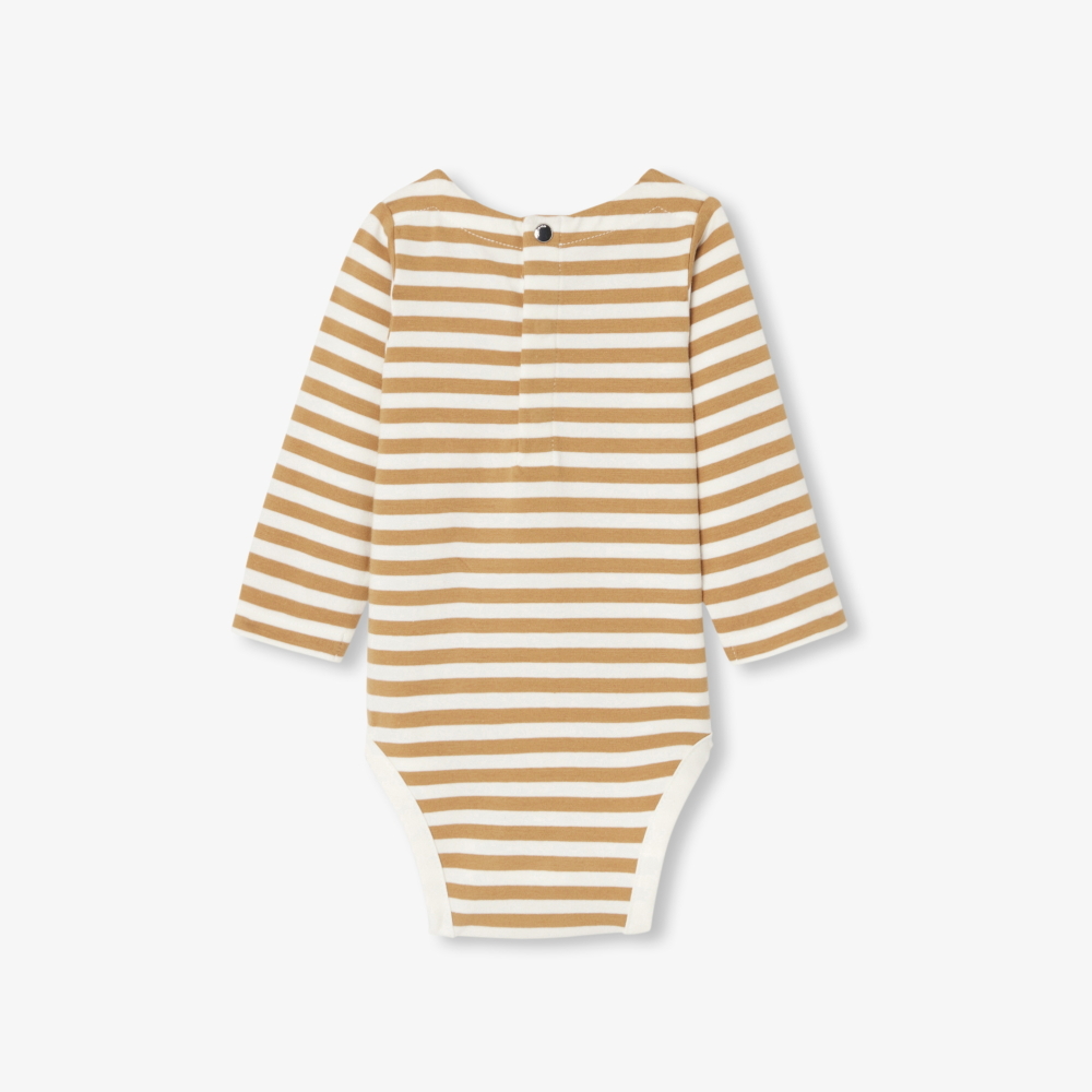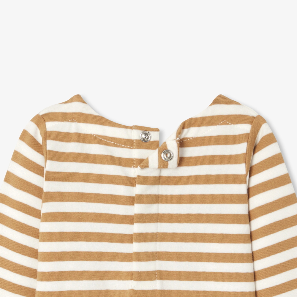 Yuvarlak yakalı, t-shirt ruhu taşıyan bu bebek uzun kollu body, mevsime uygun karamel çizgilere sahiptir. Kadife tulum ve kaşmir hırka ile giyilebilen bu yumuşak, kolay giyilen vazgeçilmez parça, arkadan ve ağdan çıtçıtlarla açılır.