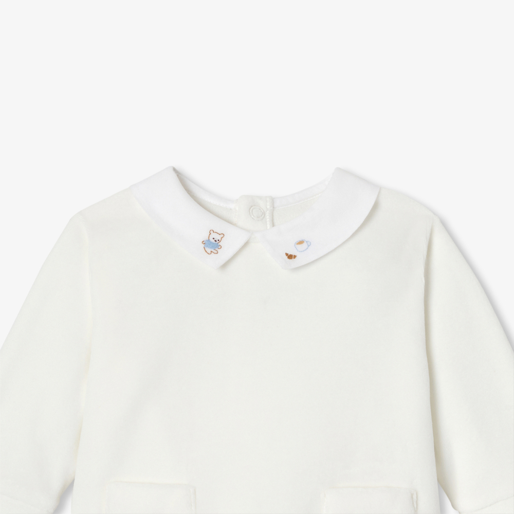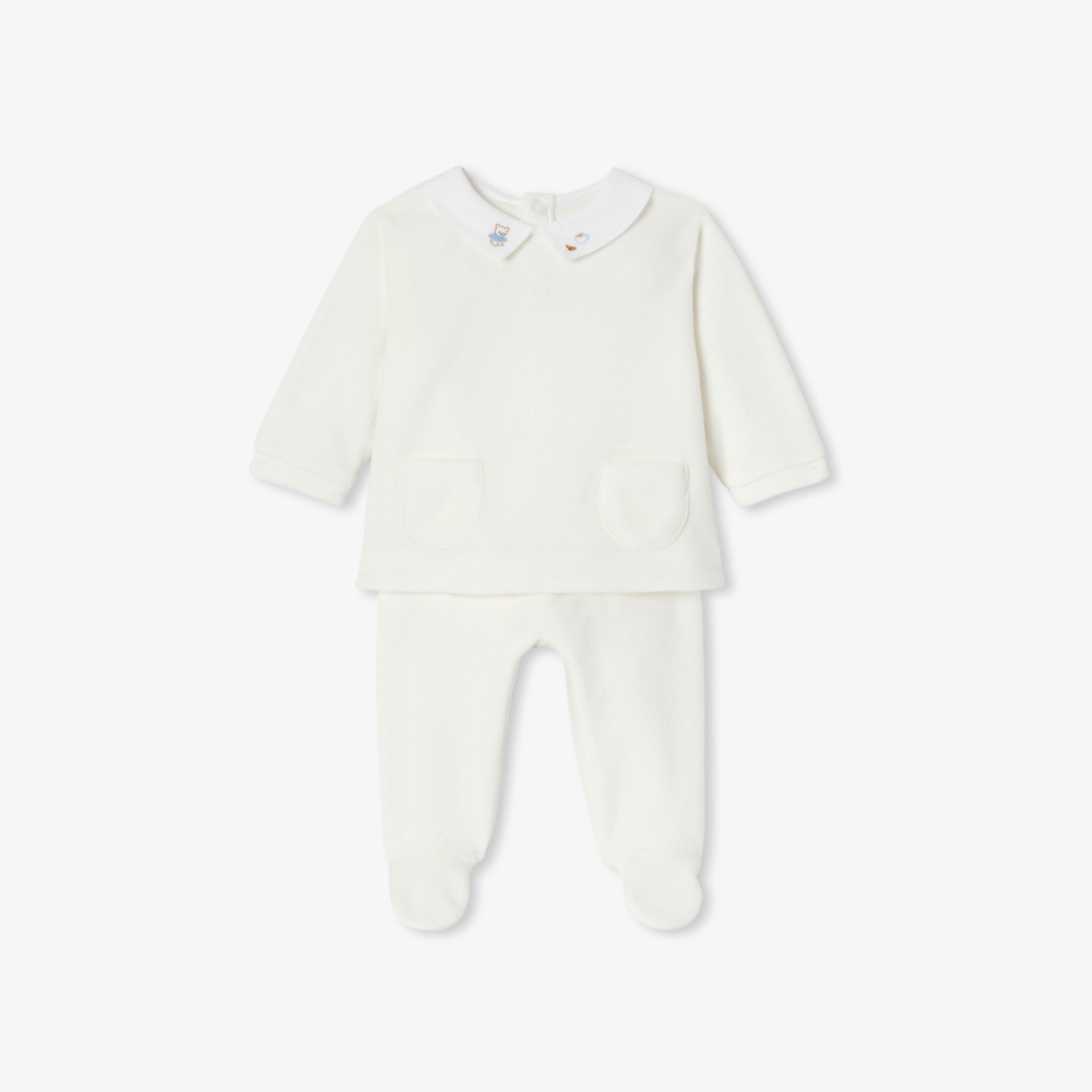Bu bebek seti, kadifenin rahatlığını ve yumuşaklığını pratiklikle birleştiriyor. Yumuşak motifli el işlemeli poplin yaka ve yama ceplerle süslenmiş, çıtçıtlı üst kısmına, kolay giydirme için lastikli bel bandına sahip, paçalı pantolon eşlik ediyor. Ev ve kreş için ideal bir ikili olan bu set, her sonbahar gardırobunda mutlaka yerini bulacaktır.