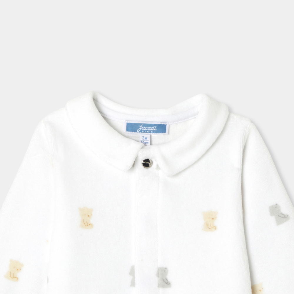 Bu vazgeçilmez bebek tulumu, minik oyuncak ayıların etrafında şefkat ve yumuşak tonların buluştuğu özgün bir baskıyla süslenmiştir. Yumuşak kadifeden üretilen bu rahat model, günlük kullanım için tasarlanmıştır ve rahatlatıcı bir uyku vaat eder. İmza poplin yakası tasarımı zenginleştirirken, görünmez çıtçıtlı fermuarı giydirmeyi kolay ve güvenli hale getirir. Doğum çeyizinde klasik bir parça olan bu ürün, hediye olarak veya bebeğin ilk gardırobunun bir parçası olarak idealdir.