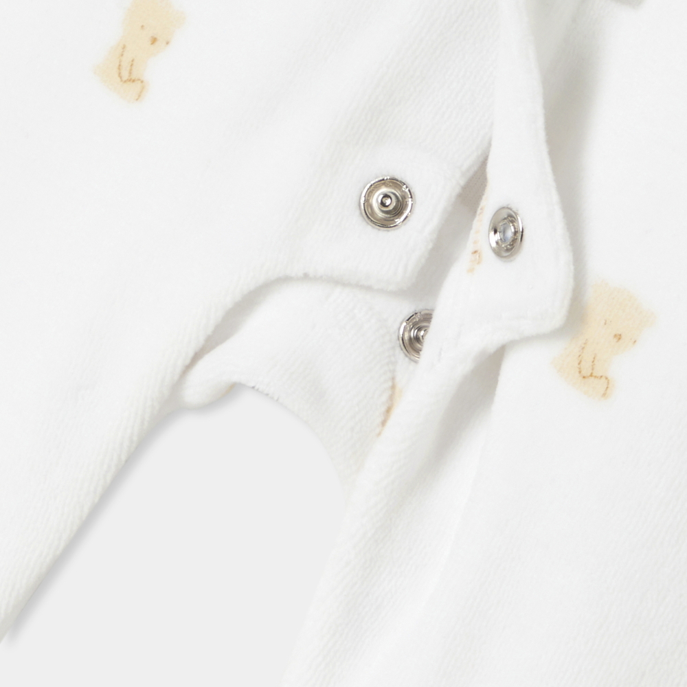 Bu vazgeçilmez bebek tulumu, minik oyuncak ayıların etrafında şefkat ve yumuşak tonların buluştuğu özgün bir baskıyla süslenmiştir. Yumuşak kadifeden üretilen bu rahat model, günlük kullanım için tasarlanmıştır ve rahatlatıcı bir uyku vaat eder. İmza poplin yakası tasarımı zenginleştirirken, görünmez çıtçıtlı fermuarı giydirmeyi kolay ve güvenli hale getirir. Doğum çeyizinde klasik bir parça olan bu ürün, hediye olarak veya bebeğin ilk gardırobunun bir parçası olarak idealdir.