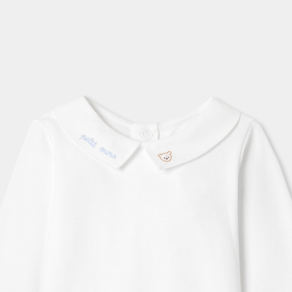 Organik pamuktan üretilen bu uzun kollu erkek bebek body, üzerinde mesaj ve oyuncak ayı bulunan el işlemeli poplin yakaya sahiptir. Salopet veya örme bir takımın altına giyilebilir, ilk çeyizinin içine giyilebilir.