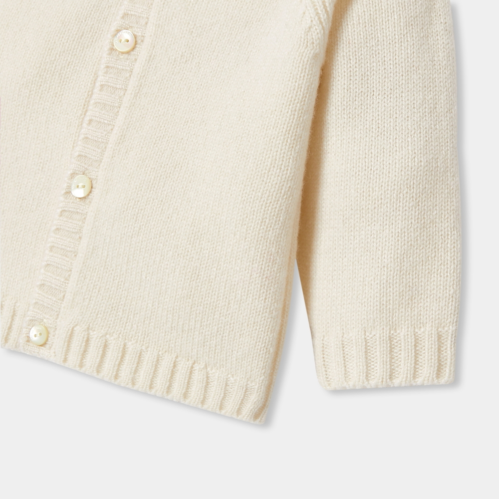 Bu zarif hırka, bebeğin ilk gardırobuna hoş bir katkı olacak. Yumuşak, tam kapsamlı kaşmirden üretilen, nervürlü detaylar, reglan kollar ve sedef düğmeler, Sonbahar silüeti için uyumlu şortlarla bir araya getirilebilen bu şık, aerodinamik tasarımı zenginleştirir.