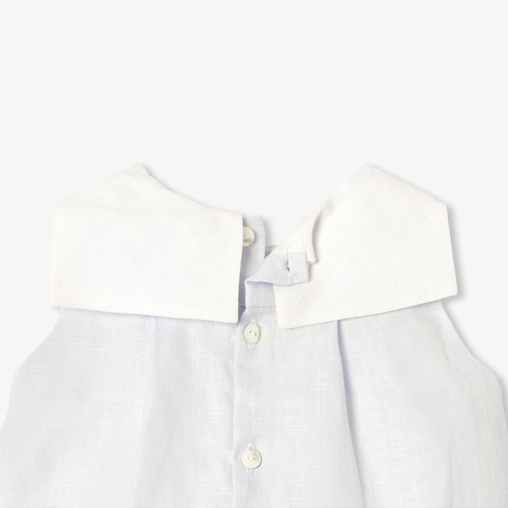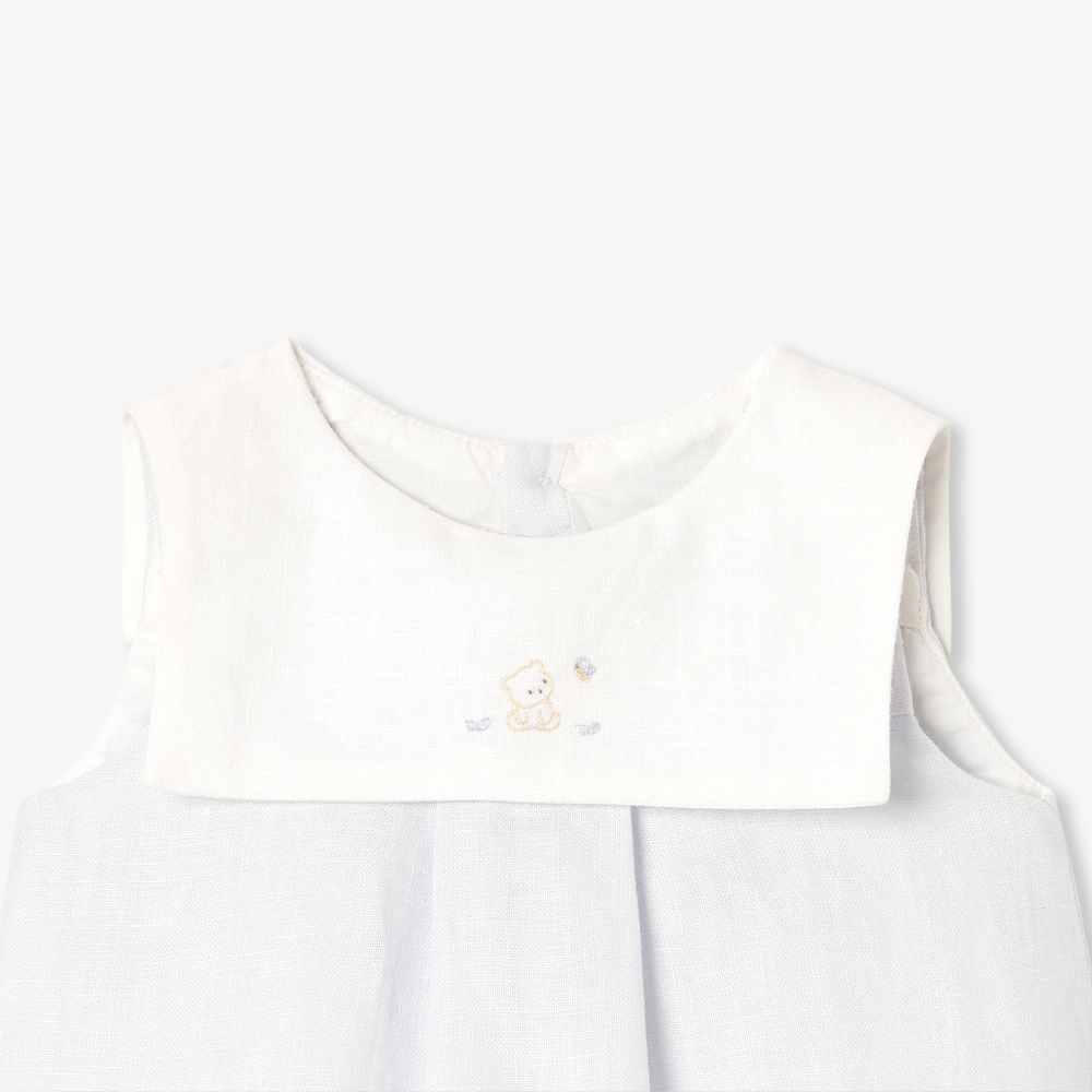 Kusursuz çizgileri ve özenle işlenmiş detaylarıyla öne çıkan bu erkek bebek tulum, yumuşak ve hafif keten dokusuyla yaz sezonuna zarif bir yorum katıyor. Elde işlenmiş sevimli ayıcık motifiyle süslenen marin esintili yaka detayı, bu parçaya çağdaş bir retro karakter kazandırıyor. Özel günlerde olduğu kadar günlük şıklıkta da tercih edilebilecek bu tasarım, incelikli duruşu ve konforlu yapısıyla bebek gardırobunun seçkin parçalarından biri olmaya aday.