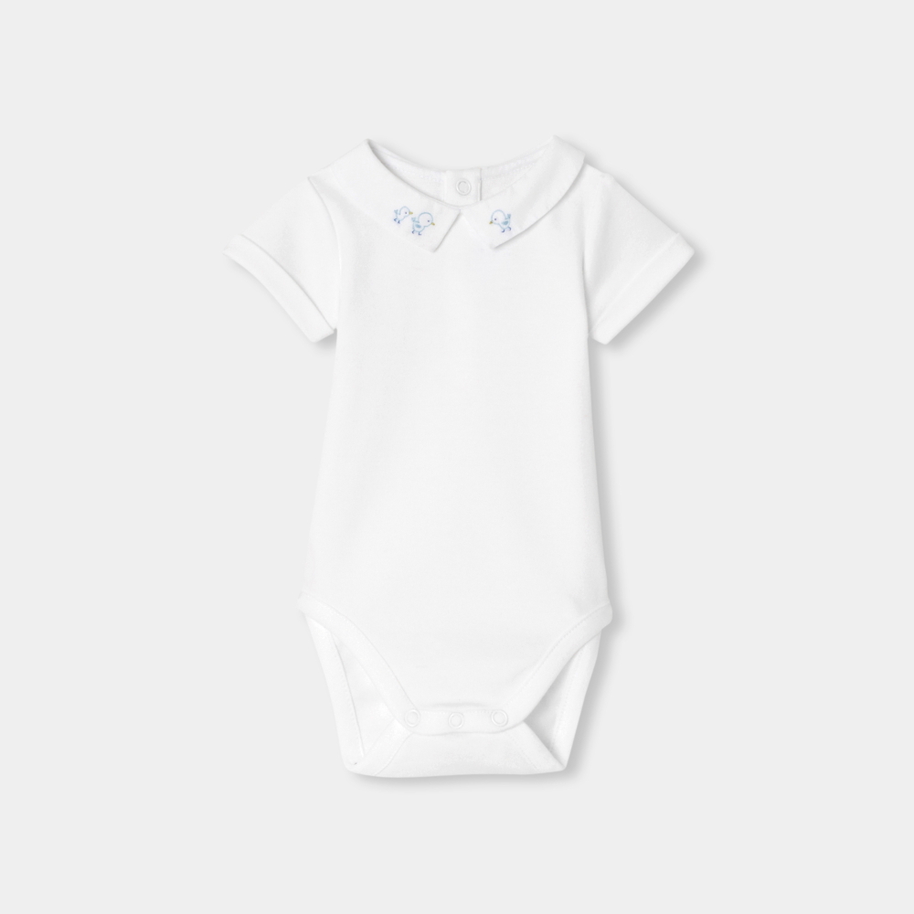 Bebeğinizin konforu düşünülerek tasarlanan bu kısa kollu body, sıcak günler için ideal bir kullanım sunar. Yumuşak pamuk interlock kumaşıyla öne çıkan model, minik ördek nakışlarıyla elde işlenmiş poplin yakası sayesinde zarif ve sevimli bir görünüm kazanır. Günlük kombinlerle kolayca uyum sağlayan bu parça, pratik yapısıyla da öne çıkar.