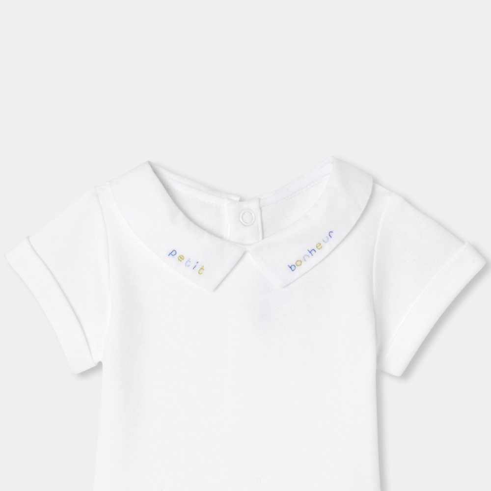 Konfor ve zarafeti bir araya getiren bu pamuk body, yaz aylarına özel kısa kollu tasarımıyla günlük kullanım için ideal bir parçadır. “petit bonheur” (küçük mutluluk) yazılı, elde işlenmiş poplin yakası modele zarif ve anlamlı bir dokunuş katar. Jean veya salopetlerle kolayca kombinlenerek bebeğinizin stilini tamamlar.