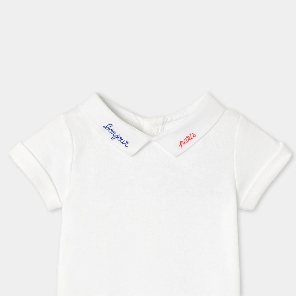 Şık ve zamansız tasarımıyla öne çıkan bu erkek bebek body, ilkbahar ve yaz kombinlerinin vazgeçilmez parçalarından biridir. Pamuk interlok kumaşıyla konfor sunan model, “Bonjour Paris” nakışlı poplin yakasıyla zarif bir dokunuş kazanır. Pötikare salopetler veya jeanlerle kolayca kombinlenebilir.
