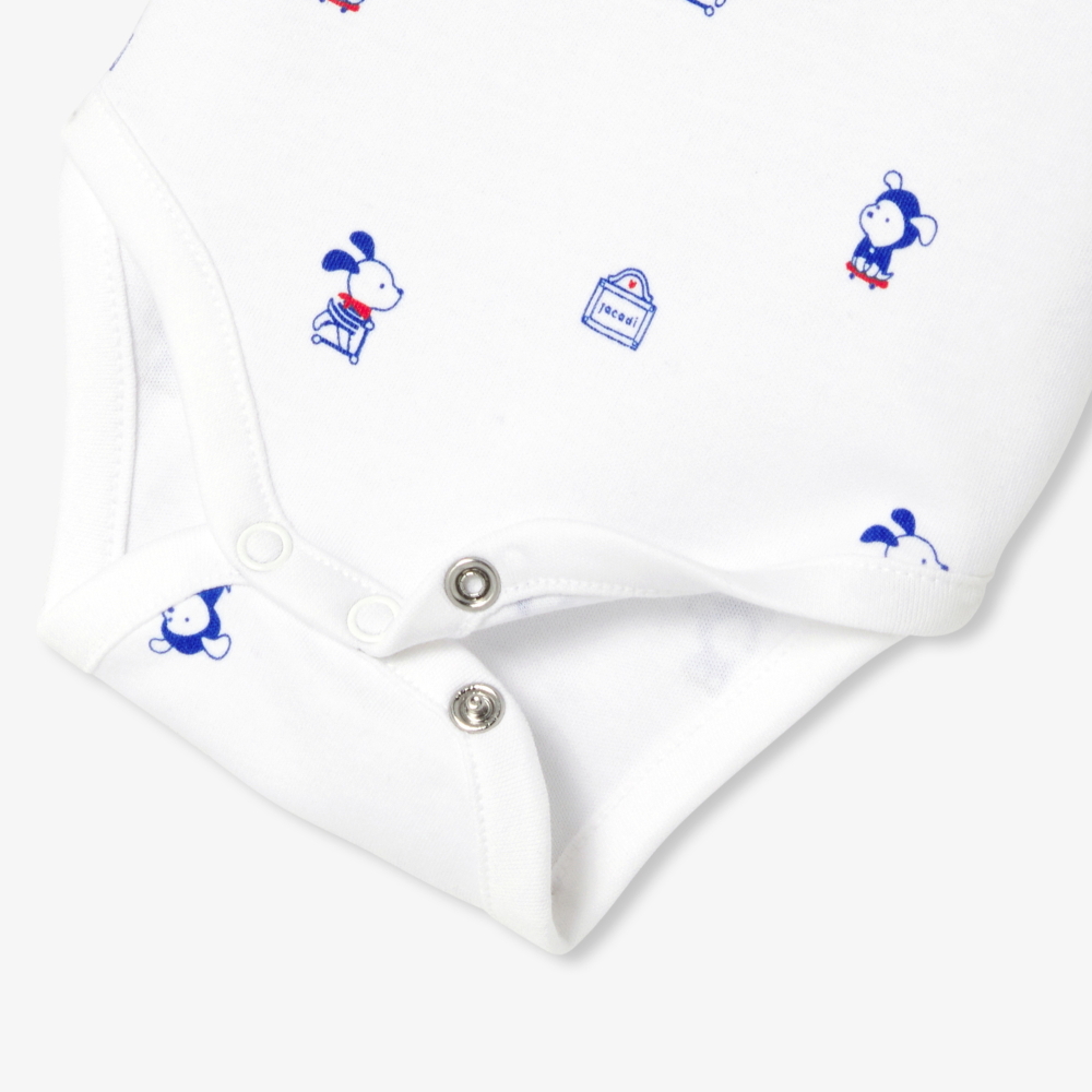 Küçük bir t-shirt görünümünde tasarlanan bu erkek bebek body, yumuşak ve hafif pamuk interlock kumaşıyla ilkbahar günleri için ideal bir kullanım sunar. Scooter üzerindeki köpek baskı detayıyla eğlenceli bir görünüm kazanan model, salopet ve hırkalarla kolayca kombinlenerek günlük stilin tamamlayıcısı olur.