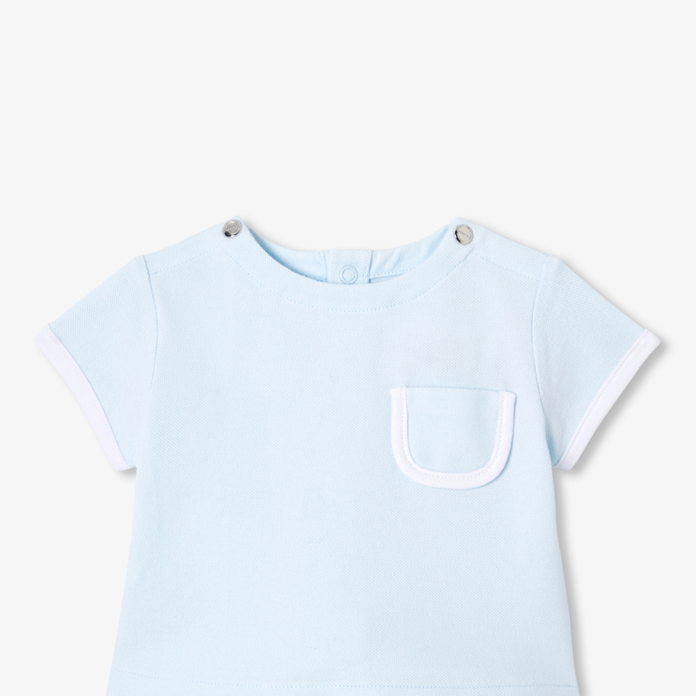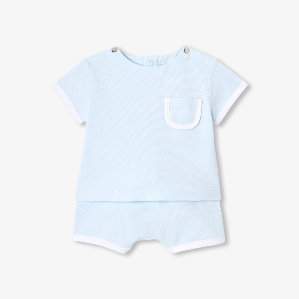 Şık ve rahat bir yaz stili sunan bu erkek bebek takım, pamuk pike kumaşıyla konfor ve zarafeti bir araya getirir. Denizci stilinden ilham alan model, kayık yaka t-shirtü ve beyaz biyeli detaylarıyla öne çıkar. Park gezilerinden sahil yürüyüşlerine kadar yaz boyunca keyifle kullanılabilecek ideal bir kombin sunar.