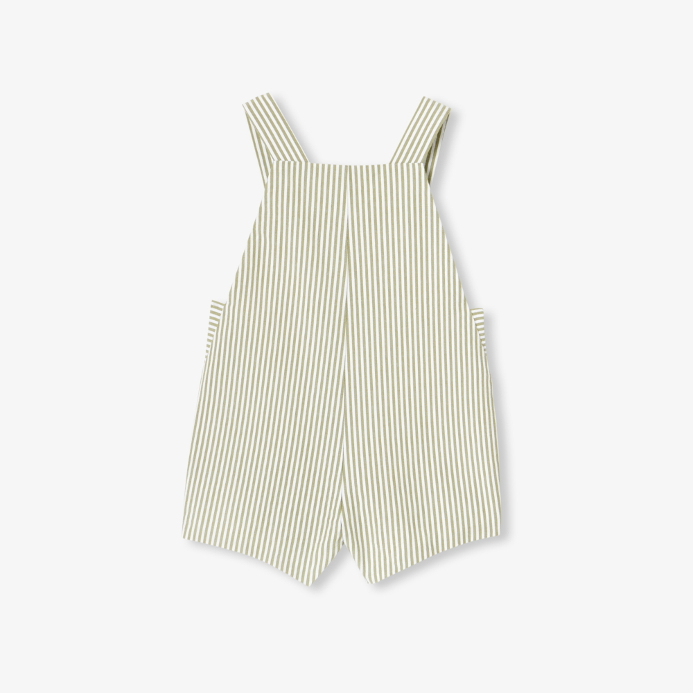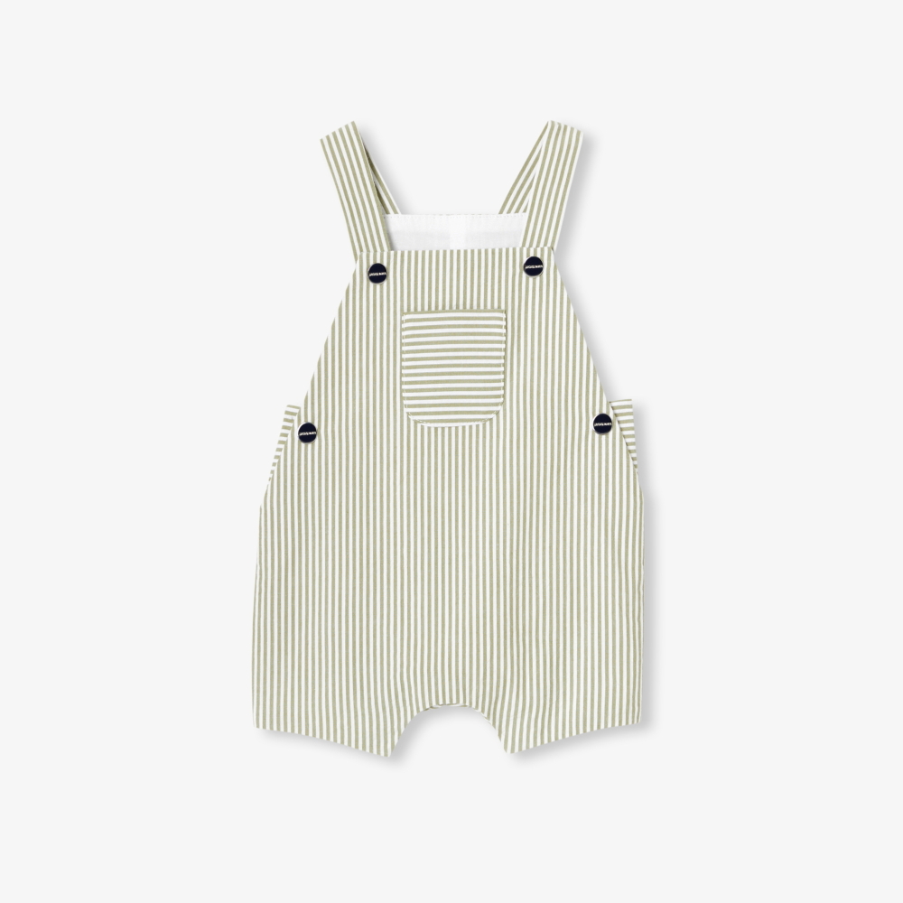 Yaz gardırobunun vazgeçilmez parçalarından biri olan bu erkek bebek salopet, çizgili seersucker (büzgülü pamuk) kumaşı ile hafif ve nefes alabilen bir kullanım sunar. Poplin astarı sayesinde konfor sağlayan model, günlük kombinlerden şehirde veya deniz kenarında yapılan yürüyüşlere kadar her an için idealdir. Rahat şıklığı ve yumuşak renkleriyle güneşli günlerde öne çıkar.