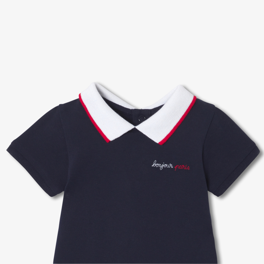 Büyüklerin stilinden ilham alan bu pamuk piqué tulum, güneşli günler için rahat ve şık bir görünüm sunar. Çizgili polo yakası ve göğüs kısmındaki “bonjour Paris” nakış detayıyla öne çıkan model, sportif şıklığı zarif bir dokunuşla buluşturur. İlkbahardan yaz aylarına kadar rahatlıkla kullanılabilecek bu tasarım, pratik yapısıyla günlük kullanım için idealdir.