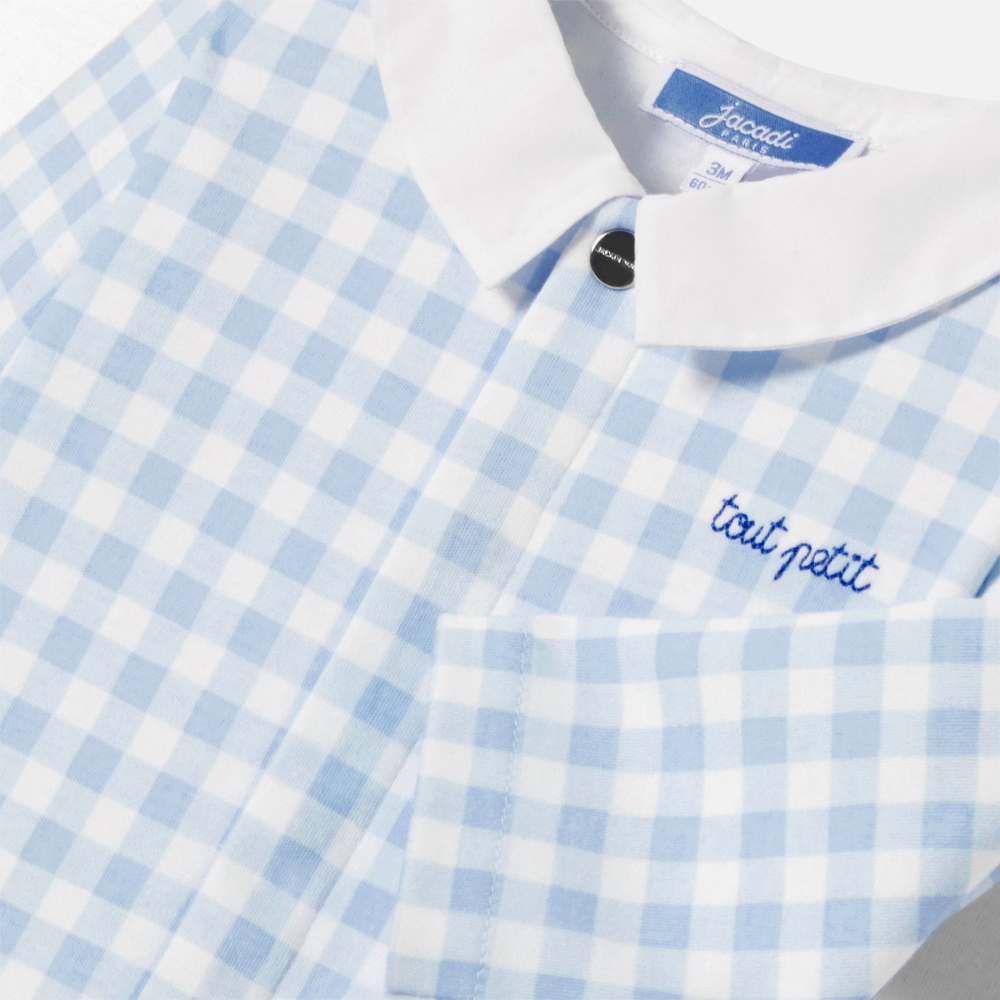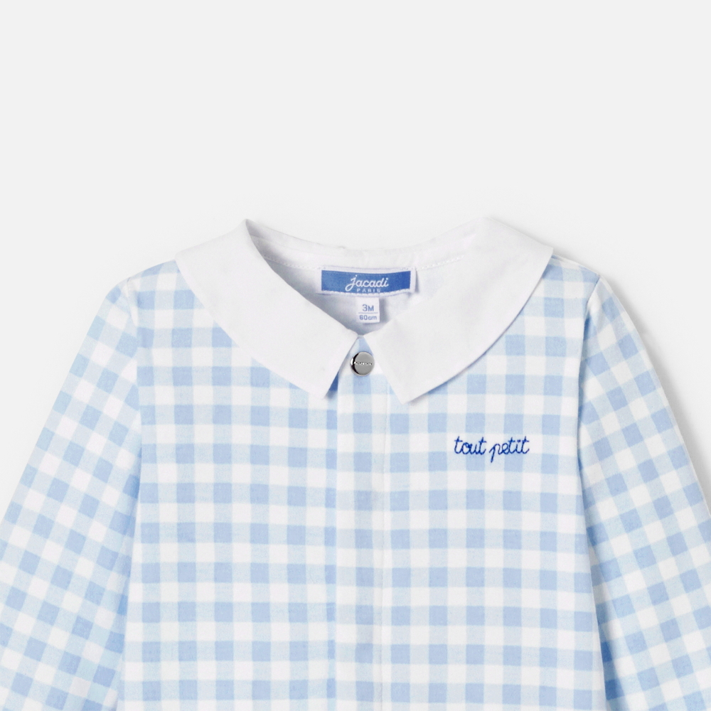 Zamansız gingham deseni, bu erkek bebek pijamalarıyla yenidoğan setinde kendini gösteriyor. Yumuşak interlok pamuktan üretilen bu pijamalar, beyaz poplin yaka ile zarif bir şekilde kaplanmış ve kolay, güvenli giydirme için önden açıktır.