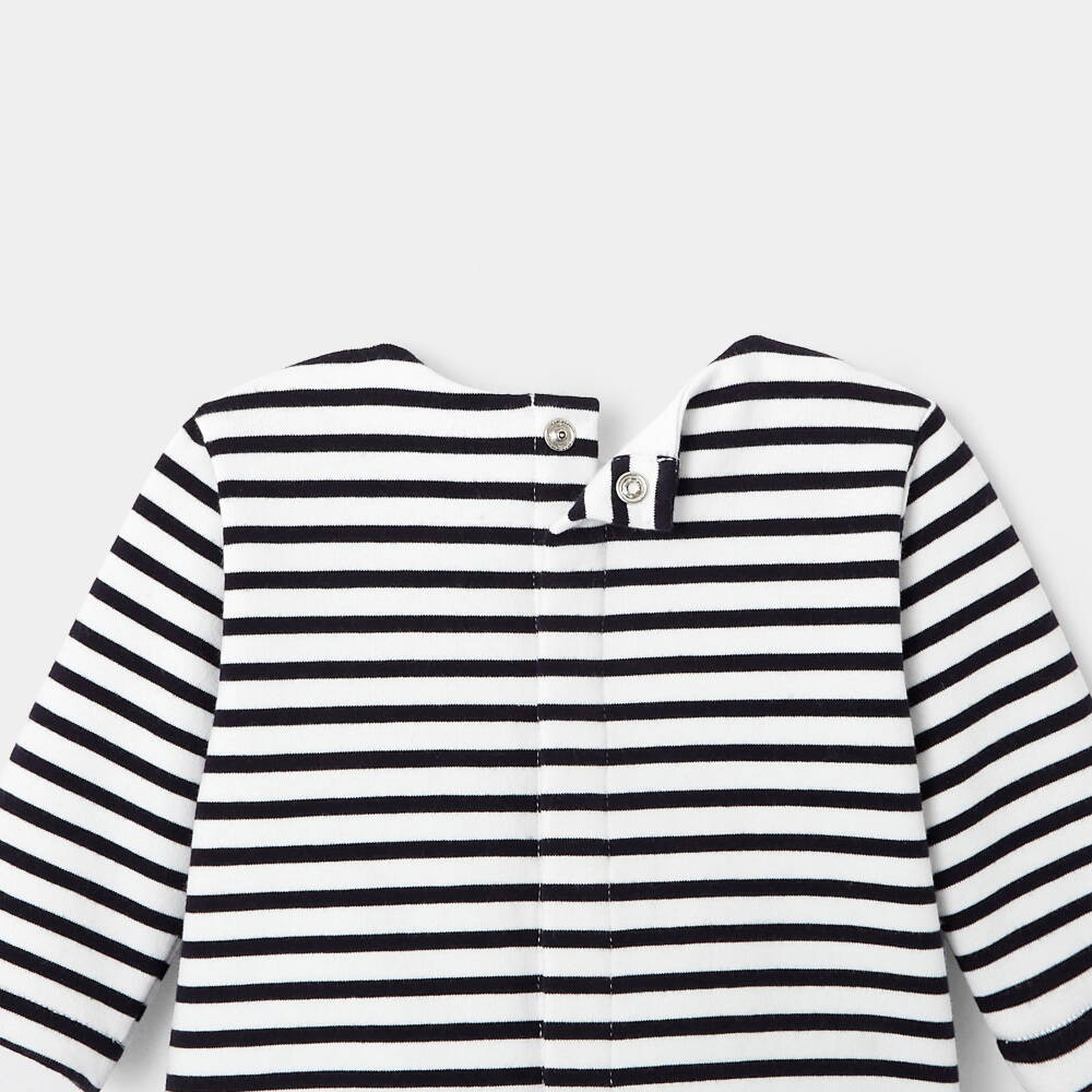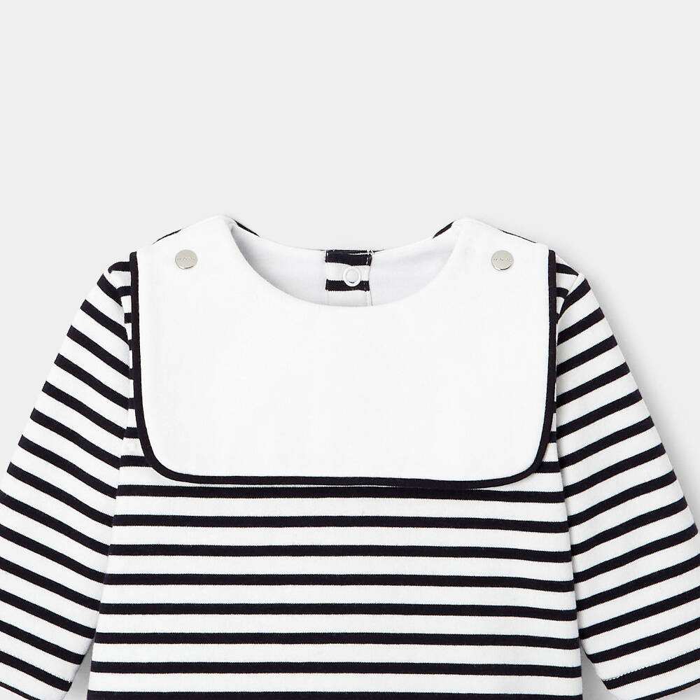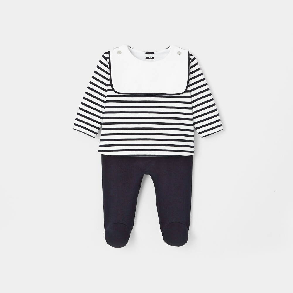 Jacadi, konfor ve inceliği bir araya getirdi. Arkadan çıtçıtla açılan denizci temalı üst ve ayaklı rahat pantolondan oluşan bu takım, bebeğin ilk gardırobunu oluşturmak için mükemmel bir seçimdir.