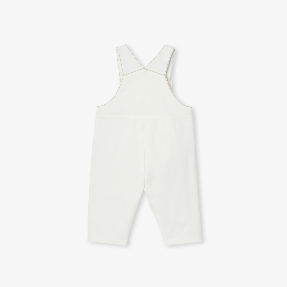 Denim kumaşın esnekliği ve örme astarın rahatlığıyla bu bebek salopeti bu sonbaharda yumuşak renklerde geliyor. Omuz ve bacak kısmındaki çıtçıtlı açıklıklar sayesinde günlük kullanım ve kreş için ideal olan bu minimalist ve çok yönlü model, uzun kollu bir tulum ve kaşmir hırka ile mükemmel bir şekilde uyum sağlar.