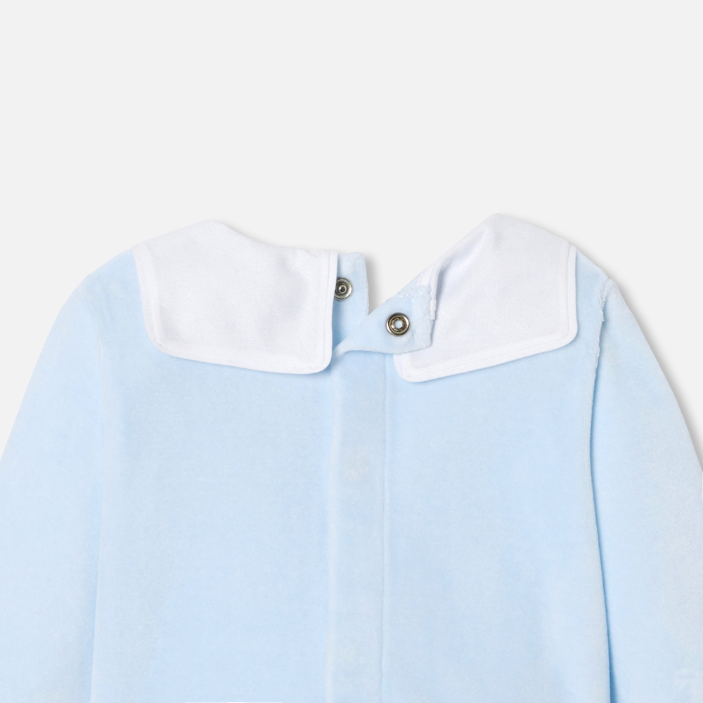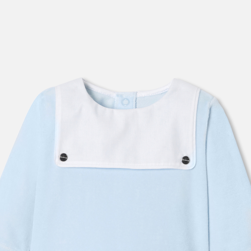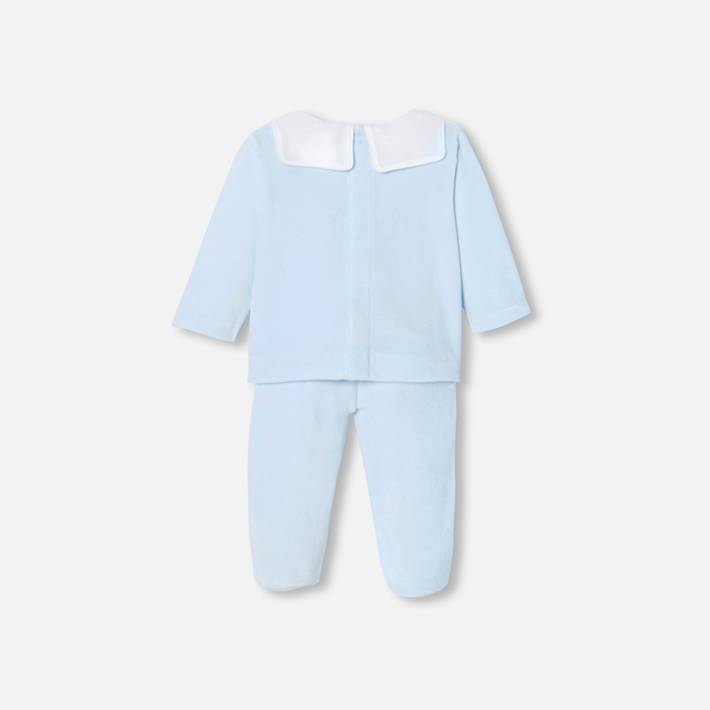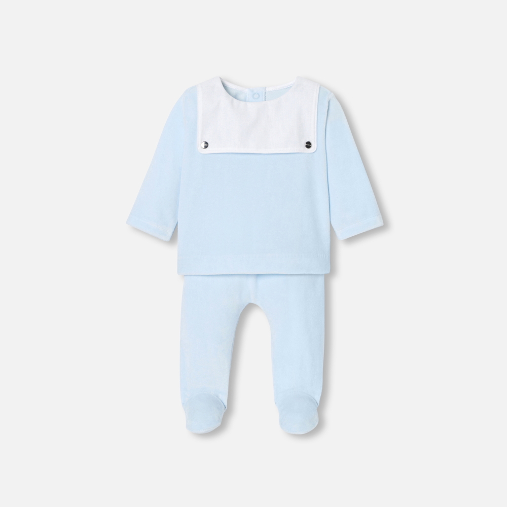 Bu erkek bebek seti, yumuşak kadifenin rahatlığını deniz kenarı stilinin zarafetiyle birleştiriyor. Arkadan açılan borulu pamuklu pike önlüklü bir üst ve elastik bel bandına sahip pantolondan oluşan bu şık ve rahat ikili, hediye için mükemmeldir ve bebeğe her gün eşlik edecektir.