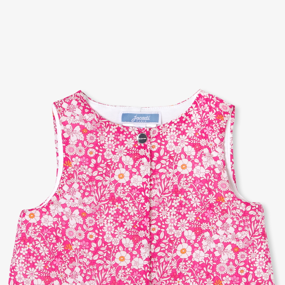 Liberty kumaştan yapılmış bu kız bebek tulumu, sezona çiçeksi ve neşeli bir hava katacak. Pamuklu astarı ve rahat dolgusu sayesinde günlük kullanım ve kreş için mükemmel olan bu pratik ve oldukça rahat parça, ön ve ağ kısmından açılarak kolayca giydirilebilir. Romantik ve renkli bir görünüm için bir body ve uyumlu bir tulumla kombinleyin.