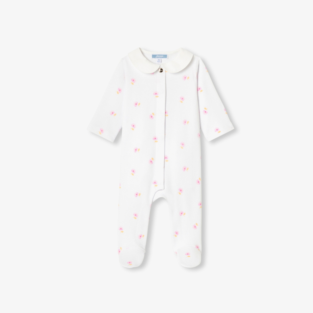 Zamansız ve şık bu kız bebek tulumu, tatlı bir gece uykusu vaat ediyor. Yumuşak, tam kapalı interlok pamuktan üretilen pijamalar, narin çiçek desenli ve beyaz poplin Peter Pan yakalı. Önden çıtçıtlı yapısı sayesinde pratik ve kolayca giyilebilen pijamalar, vazgeçilmez olacak.