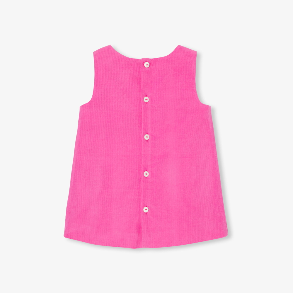 Bu kız bebek önlük elbise, yumuşak kadifenin zarafetini, taraklı çiçek ve kutu pileli ön kısmın özgünlüğüyle birleştiriyor. Arka düğmeli ve pamuklu vual astarı sayesinde şık, pratik ve rahat olan bu ikonik parçayı, canlı çiçeklerle renklendirilmiş bir hırka ve deri bilekte botlarla kombinleyerek retro ve şehirli bir görünüm elde edebilirsiniz.