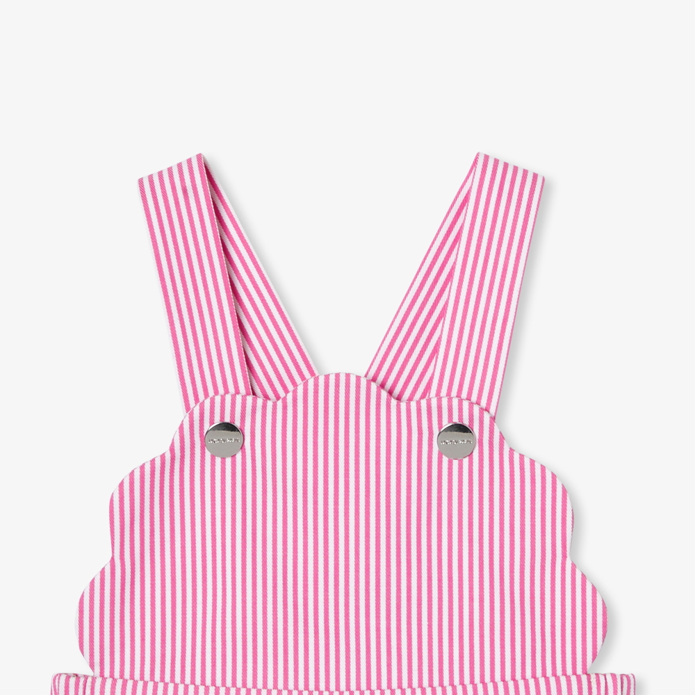Tasarımcılar, zamansız kız bebek salopetini her sezon yeniden yorumlayarak modaya uygun hale getiriyor. Çizgili twill kumaş, taraklı önlük ve çapraz sırt askılarının şık ve geometrik kombinasyonu, aradığınız her şeyi sunuyor. Konfor için örme kumaş astarlı ve çıtçıtlı ağı sayesinde kolayca giyilebilen bu tulum, Peter Pan yakalı bir body ve hırka ile mükemmel uyum sağlıyor.