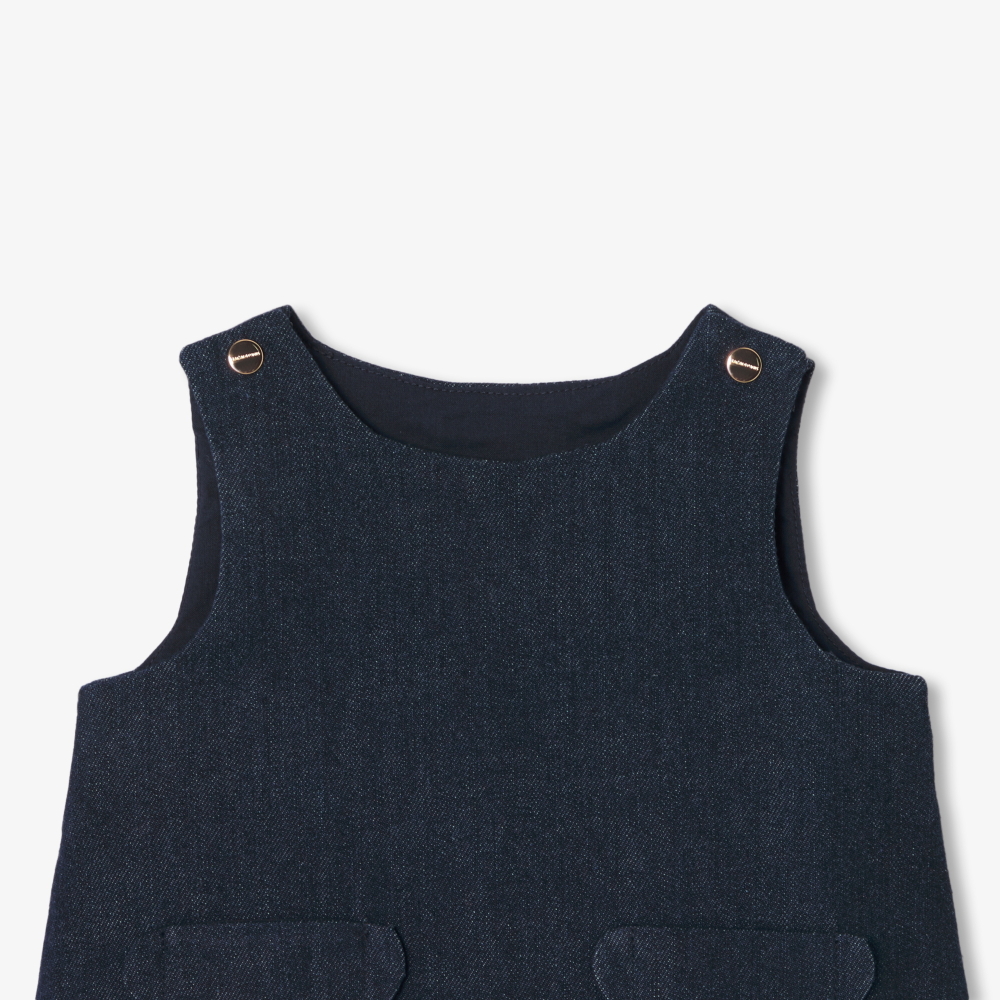 Zamansız kız bebek askılı elbise, modern bir dokunuşla denim kumaştan tasarlandı. Yumuşak ve rahat pamuk voil astarı, dalga kesim yama cepler ve imza niteliğindeki omuz çıtçıtlarıyla tamamlanan bu elbise; fırfırlı bir body ve kalp desenli bir hırka ile kombinlendiğinde şık ve Parisli bir görünüm sunar.