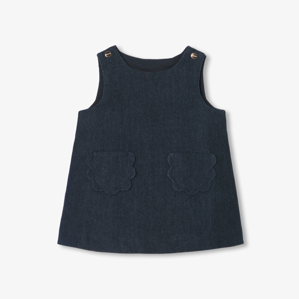 Zamansız kız bebek askılı elbise, modern bir dokunuşla denim kumaştan tasarlandı. Yumuşak ve rahat pamuk voil astarı, dalga kesim yama cepler ve imza niteliğindeki omuz çıtçıtlarıyla tamamlanan bu elbise; fırfırlı bir body ve kalp desenli bir hırka ile kombinlendiğinde şık ve Parisli bir görünüm sunar.