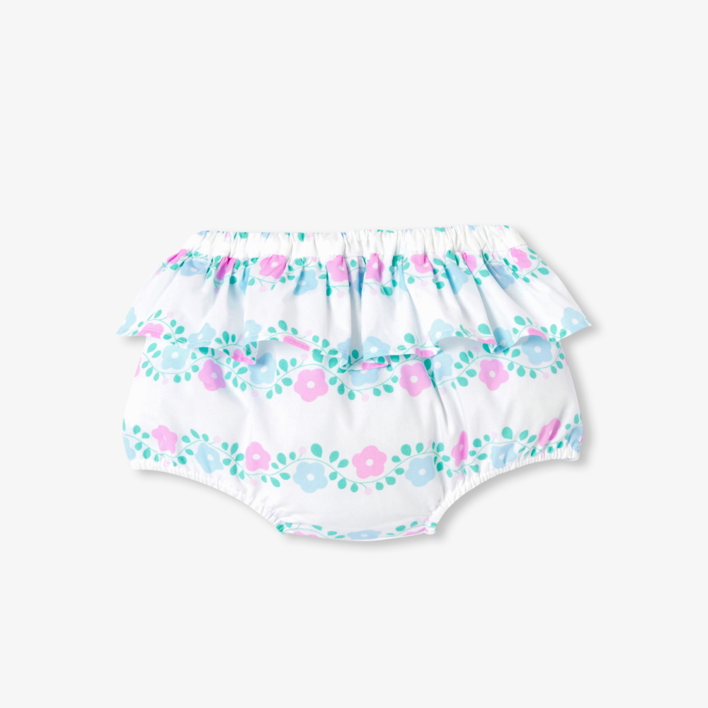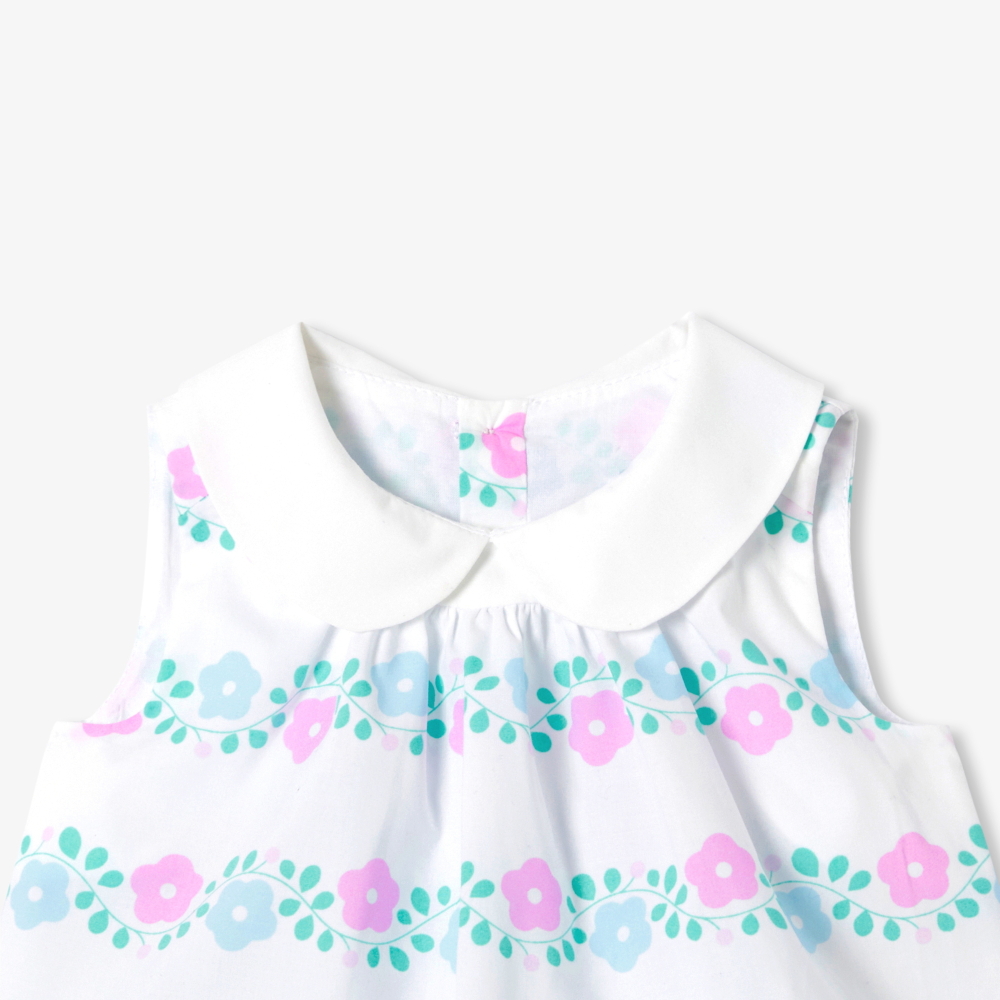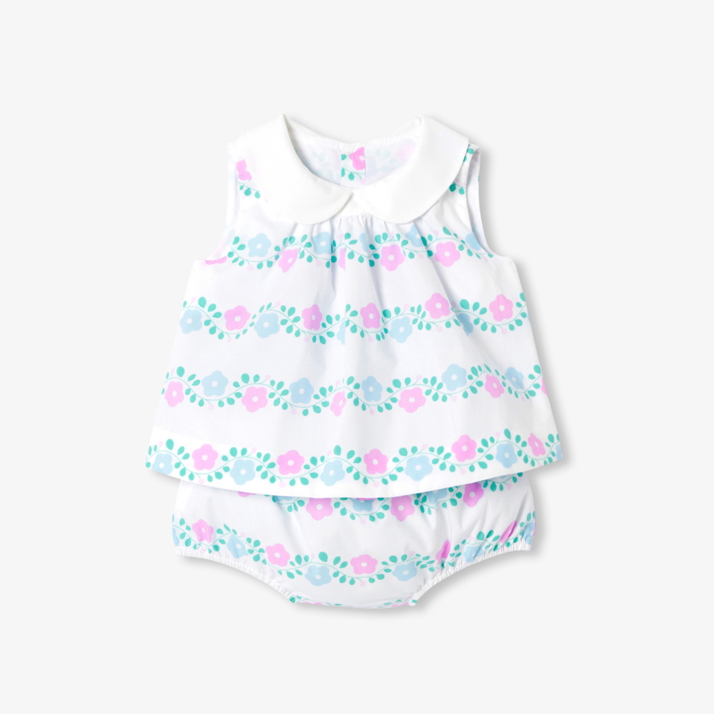 Sezonun romantik ve zarif ruhunu yansıtan bu kız bebek takım, pastel tonlardaki çiçeklerin modern çelenkler oluşturduğu pamuk poplin kumaşıyla öne çıkıyor. Peter Pan yakalı üst parça, ön bölümde yer alan büzgü detayıyla hoş bir hacim kazanırken, fırfırlı bloomer bu şık ikiliyi incelikle tamamlıyor. İlk tatillerden özel kutlamalara kadar uzanan anlarda zarif bir görünüm sunan bu tasarım, bebek gardırobuna şiirsel bir dokunuş katıyor.