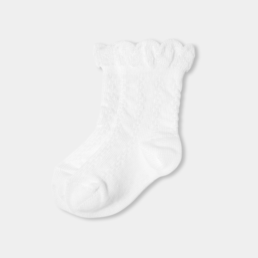 Pamuk pike kumaştan dalgalı bilek detayıyla zenginleşen bu kız bebek çorap, zarif ve özenli bir görünüm sunuyor. Babetler ya da rugan Mary Jane ayakkabılarla kusursuz bir uyum yakalayan bu model, hem özel gün kombinlerine hem de günlük stillere şık bir son dokunuş katıyor. Yumuşak yapısı sayesinde konfor sunan bu tasarım, aynı zamanda zarif bir hediye alternatifi olarak da öne çıkıyor.