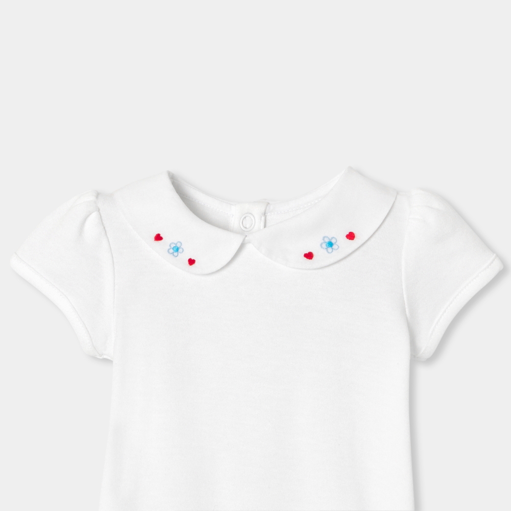 Yumuşak pamuk interlock kumaşı ve elde işlenmiş Peter Pan yakasıyla öne çıkan bu kız bebek body, yaz aylarında elbise veya bloomer şortlarla mükemmel uyum sağlar. Günlük kullanım için ideal olan bu parça, bebeğinizin gardırobuna zarif bir dokunuş katar.