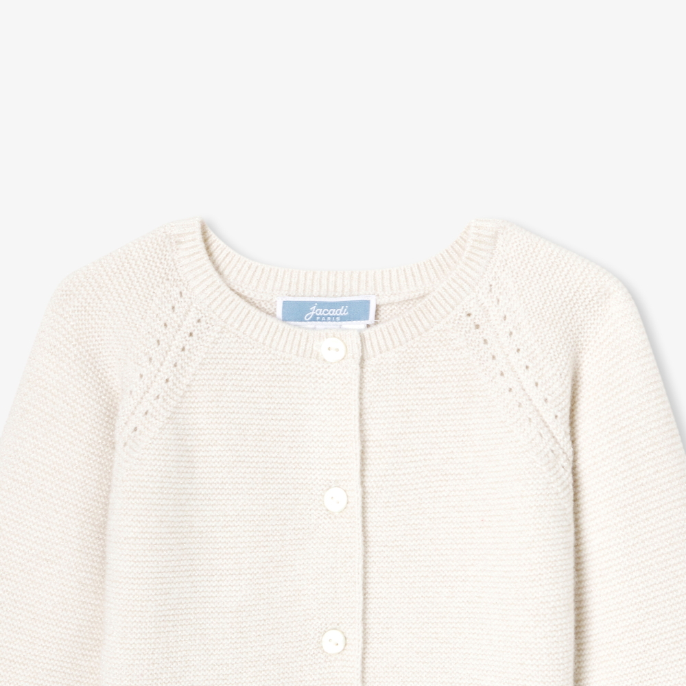 Altın lurex detaylarıyla zarif bir dokunuş kazanan bu kız bebek hırkası, sıcak ve kaplayıcı klasik örgü triko ile şıklığını artırır. Kollarındaki delikli örgü detayı ve doğal inci düğmeleri, bu yün hırkayı orta mevsim kombinleri için ideal, hoş bir parça haline getirir.