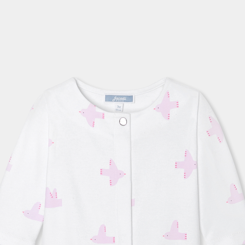 Küçük çocuğunuza ilk günden itibaren eşlik etmek üzere tasarlanan bu kız bebek tulumu, zarafet ve rahatlık arasında tam doğru dengeyi sağlar. Yumuşak, esnek pamuklu interlok kumaştan ve hassas bir desenden üretilen bu pratik, rahat model, ön ve kasık çıtçıtlı açıklıkları sayesinde giyilmesi kolaydır ve ilk setine hoş bir katkı olacaktır.