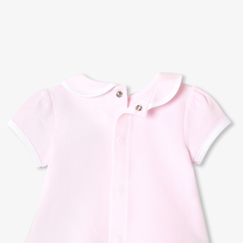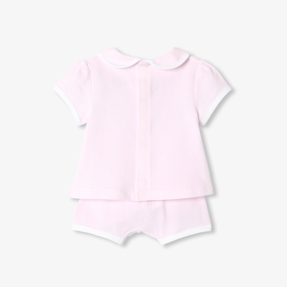 Yaz sezonunun vazgeçilmez parçalarından biri olan bu kız bebek takım, casual chic stilin zarif bir yorumunu sunuyor. Peter Pan yakalı t-shirt ile elastik belli bloomer’dan oluşan bu konforlu ikili, doğal sedef düğme detayı ve beyaz biyeleriyle incelik kazanıyor. Günlük kullanımda olduğu kadar tatil valizinde de kendine kolayca yer bulan bu şık tasarım, bebeğinizin yaz gardırobunu rafine bir dokunuşla tamamlıyor.