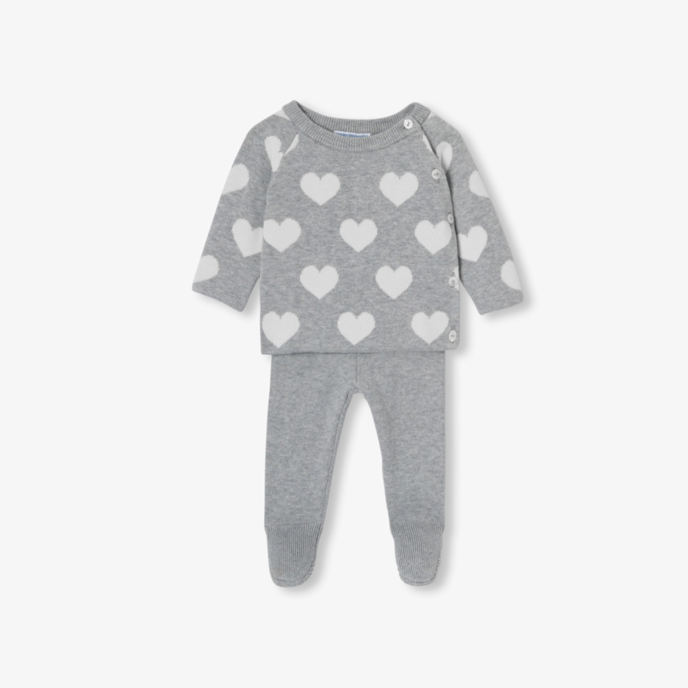 Jersey pamuk yumuşaklığı ve kalp motifiyle bu bebek takımı, günlük kullanım için mükemmel bir seçimdir. Ön kısmı düğmeli üstü ve bel lastikli ayaklı pantolonu sayesinde kolay giyilip çıkarılır ve ilk haftalardan itibaren giyilmeye hazırdır. Hem kız hem erkek bebekler için uygundur.