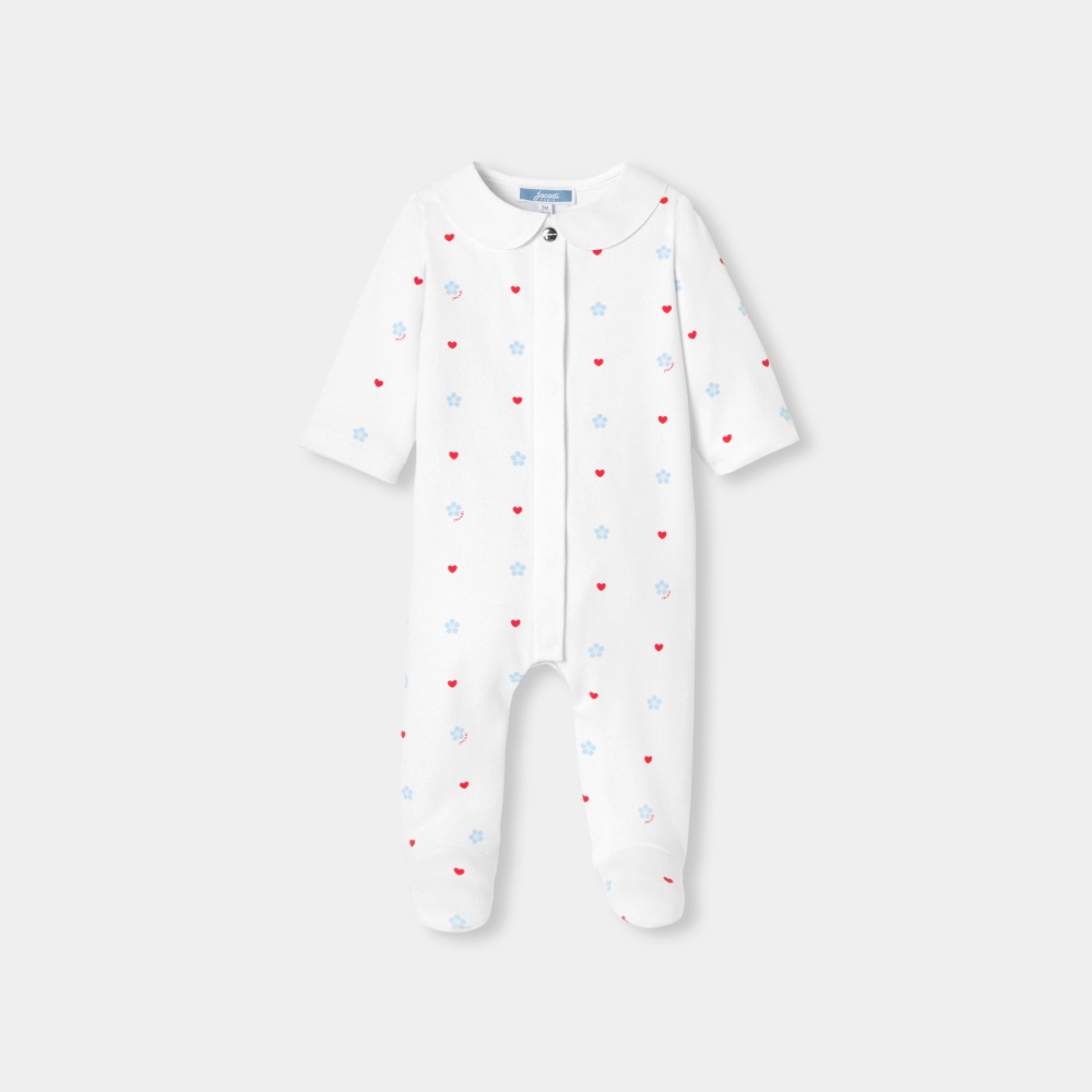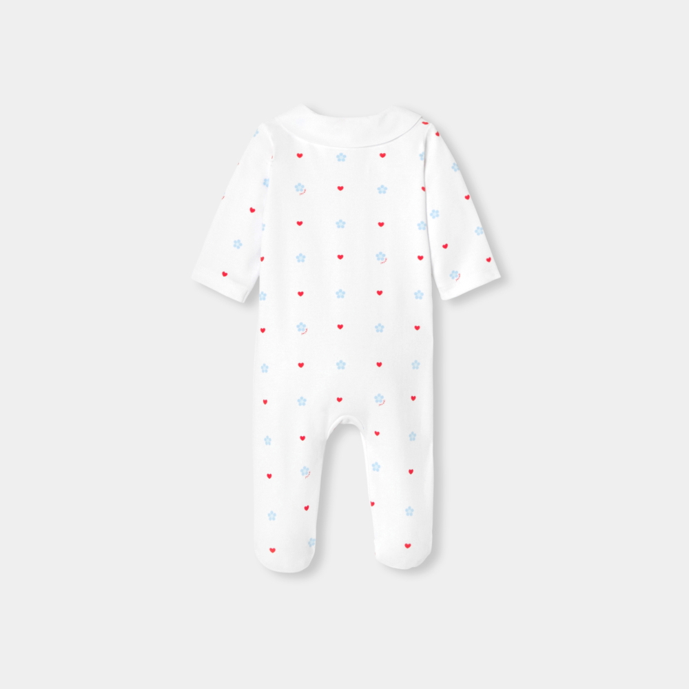 Gardırobun vazgeçilmez parçalarından biri olan bu kız bebek tulum, zarafet ve modernliği dengeli bir şekilde bir araya getirir. Pamuk interlock kumaşıyla yumuşak ve konforlu bir kullanım sunan model, önden gizli çıtçıt kapaması sayesinde kolay giydirme imkânı sağlar. Poplin Peter Pan yakası ve kalp ile çiçek desenleriyle zenginleşen bu tasarım, ister tek başına ister body üzerine rahatlıkla kullanılabilir.