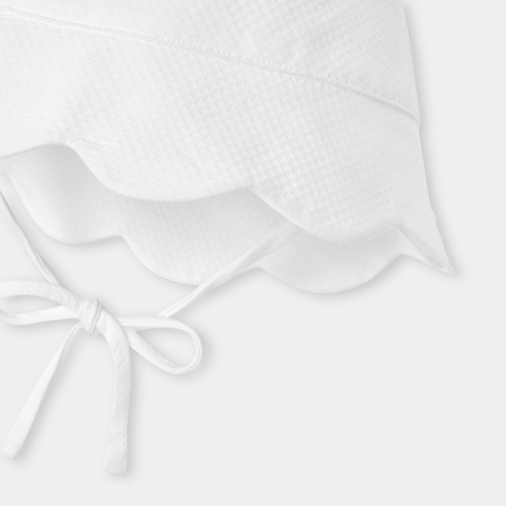 Yaz gardırobunun vazgeçilmez parçalarından biri olan bu kız bebek şapka, sade ve zarif tasarımıyla öne çıkar. Pamuk piqué kumaşı ve yumuşak dokusuyla konfor sunan model, dalgalı kenar detayıyla şık bir görünüm kazandırır. Elbise veya tulumlarla kolayca kombinlenerek hem günlük kullanım hem de özel anlar için ideal bir tamamlayıcıdır.
