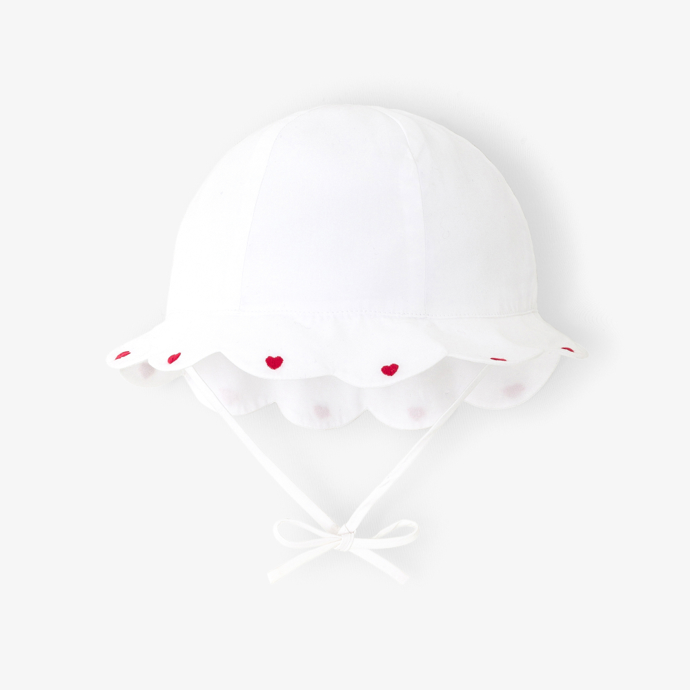 Dalgalı kenar detayı ve kalp nakışlarıyla öne çıkan bu kız bebek şapka, sezonun en şık tamamlayıcı parçalarından biridir. Yumuşak ve esnek organik pamuk kumaşıyla konfor sunan model, bağcık detayları sayesinde başa tam uyum sağlar. İlkbahardan yaz sonuna kadar bebeğinizi korurken, aynı koleksiyondaki ürünlerle uyumlu şekilde kombinlenebilir.