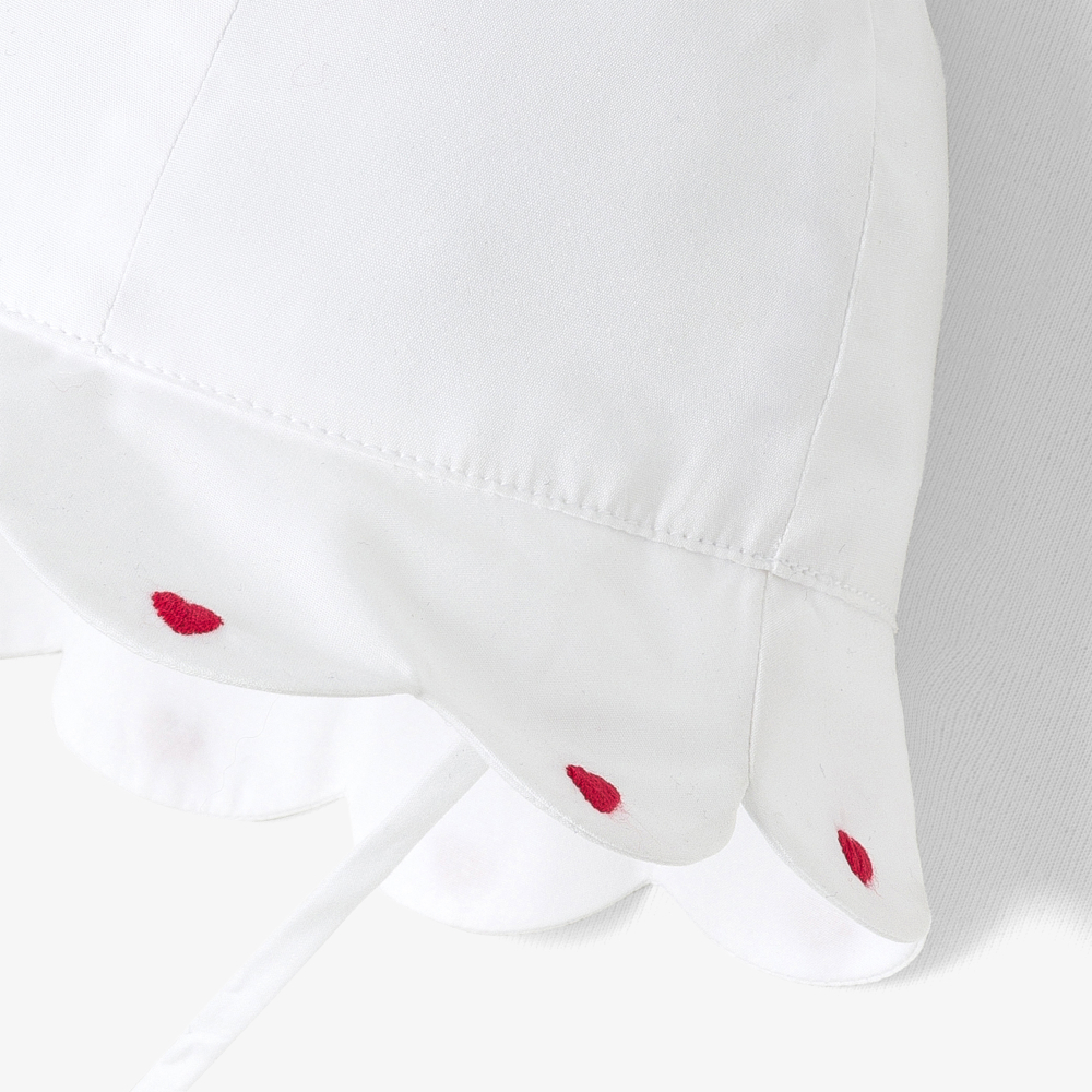 Dalgalı kenar detayı ve kalp nakışlarıyla öne çıkan bu kız bebek şapka, sezonun en şık tamamlayıcı parçalarından biridir. Yumuşak ve esnek organik pamuk kumaşıyla konfor sunan model, bağcık detayları sayesinde başa tam uyum sağlar. İlkbahardan yaz sonuna kadar bebeğinizi korurken, aynı koleksiyondaki ürünlerle uyumlu şekilde kombinlenebilir.
