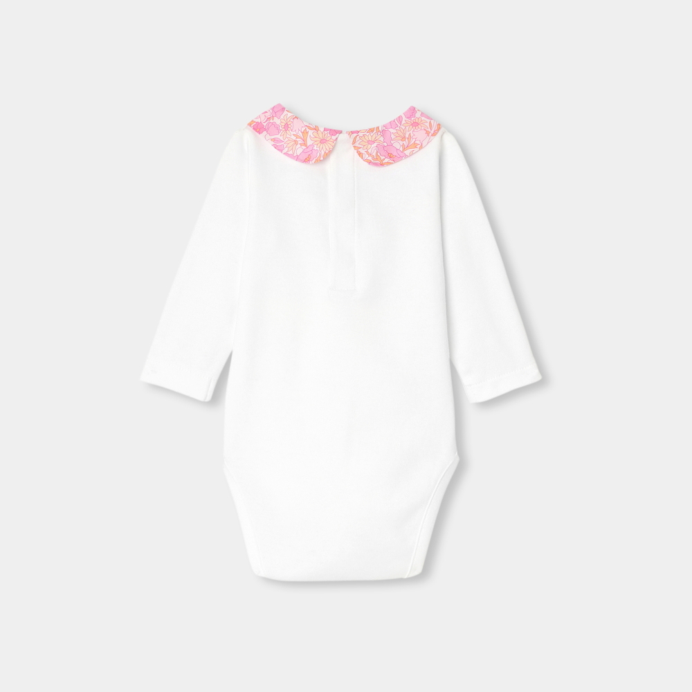 Günlük gardırobunuzun olmazsa olmazı olan bu kız bebek body, bu sezon her kıyafetin vazgeçilmezi olacak. Yumuşak ve esnek organik pamuktan üretilen klasik Peter Pan yakası, enerjik bir görünüm için Liberty kumaşla süslenmiştir. Sırt ve kasık çıtçıtlarıyla pratik ve kolay giyilebilir, kadife bir elbise veya tulumla kombinleyebilirsiniz.