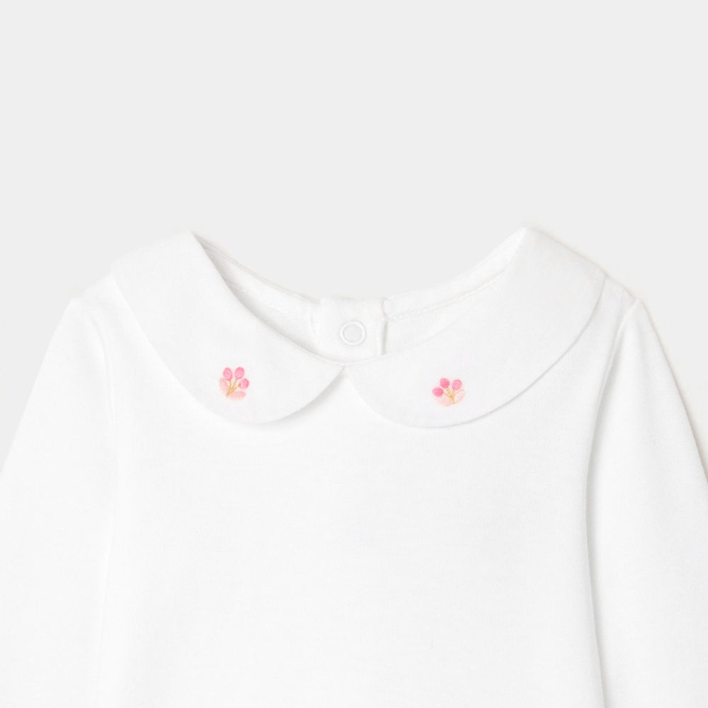 Gardırobunuzun vazgeçilmezi olan bu pamuklu interlok kumaştan kız bebek body, rahatlığı el işlemeli poplin yakanın zarafetiyle birleştiriyor. Kolay giydirme için tasarlanan, sırt ve kasık çıtçıtlı bu tulum, minik yavrunuza günün her anında eşlik etmek için bir elbise veya tulumun altına giyilebilir.
