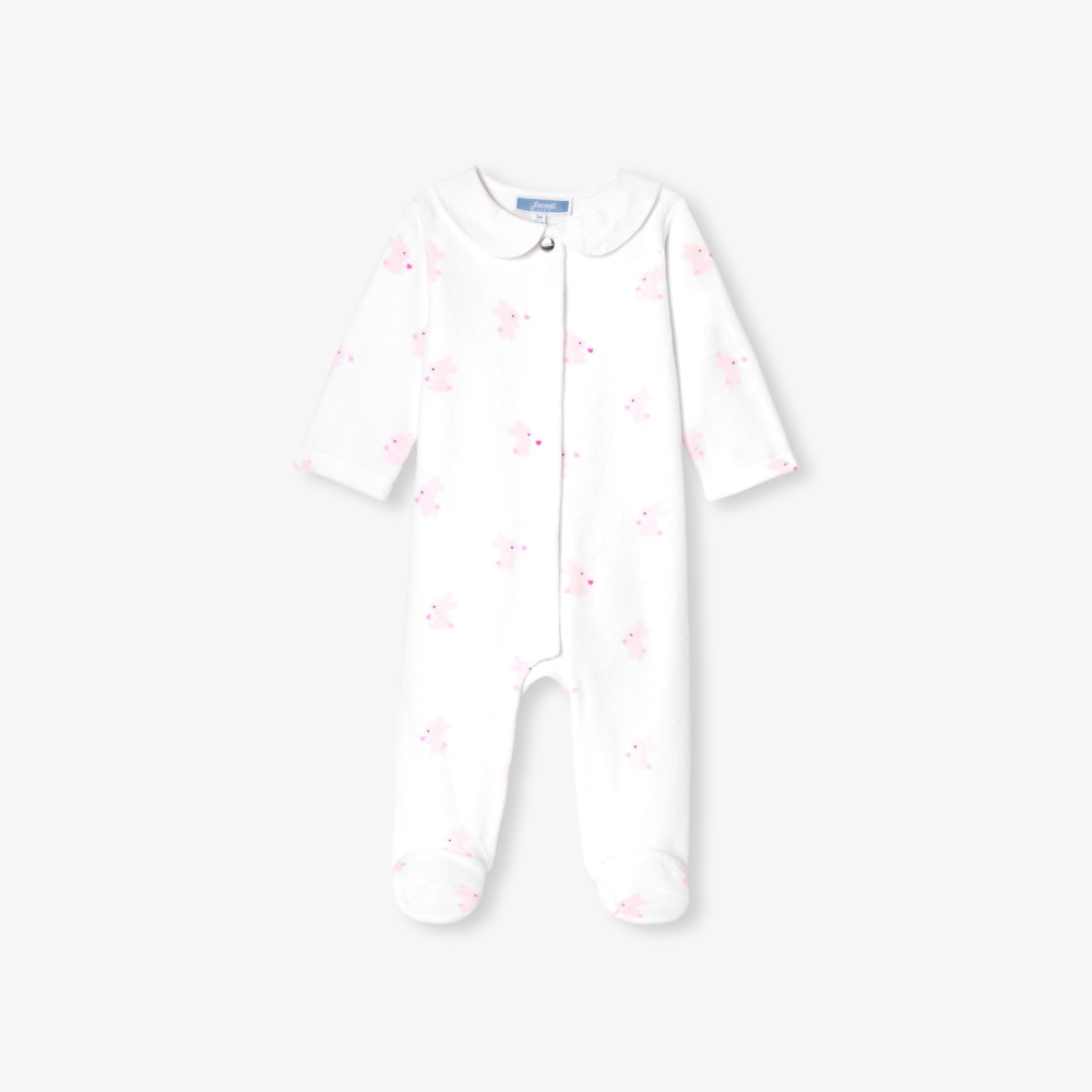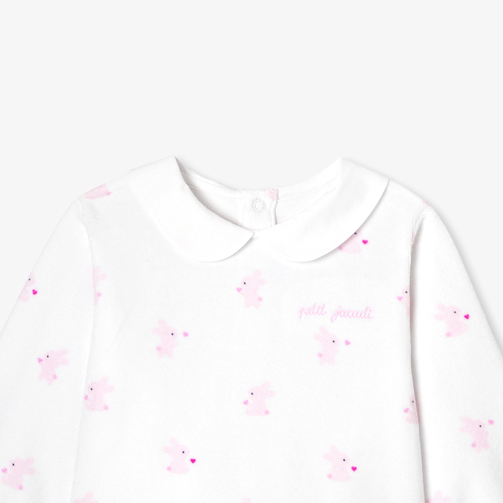 Bu kız bebek tulumu için kadifenin yumuşaklığı ve desenin hassasiyeti bir araya geliyor. Yumuşak ve esnek kadife, poplin yaka, minik tavşanlar ve kolay ve güvenli giydirme için önden açılan kısım, ilk çeyiz için olmazsa olmazı tamamlıyor. Bu model, göğüs kısmındaki işlemelerle 18 ve 24 aylık bedenler için 2 parçalı, ayaksız pijamaya dönüşebiliyor.