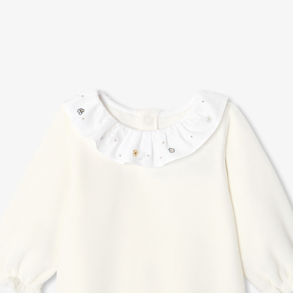 Hayallere dalmak için ideal olan bu kız bebek tulumu, şık ve sade çizgileriyle öne çıkar. Yumuşak ve esnek kadife kumaştan üretilmiş model, elde işlenmiş poplin fırfır detayıyla zarif bir dokunuş kazanır. Arkadan açılan çıtçıtları sayesinde kolay giydirilir ve çıkarılır. Kendiniz veya sevdikleriniz için doğum hediyesi olarak mükemmel bir seçimdir.