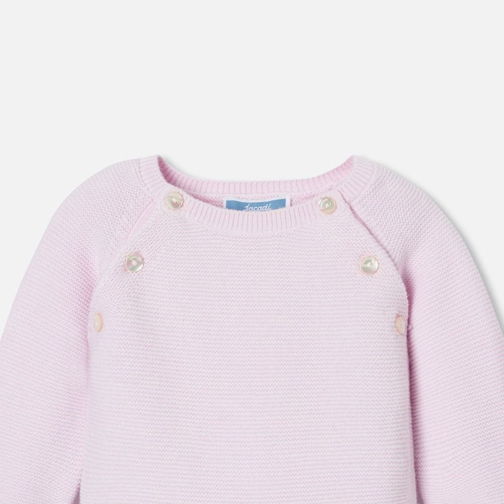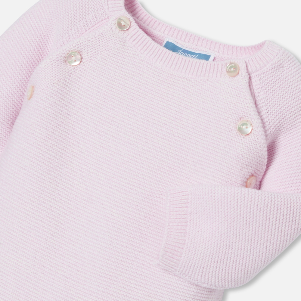 Jacadi bebek setinde ikonik bir tasarım olan bu kız bebek tulumu, sürdürülebilir yün ve organik pamuktan yapılmış yumuşak örgüsü sayesinde minik yavrunuzu ilk günlerden itibaren koruyacaktır. Zamansız ve büyüleyici parça, düğmeli yan açıklığı ve çıtçıtlı kasık kısmı sayesinde kolayca giyilebilir ve ilk gardırobunda yerini bulacaktır.